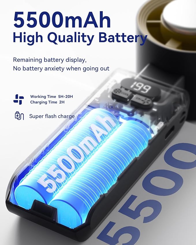 - 20H Max Cooling Time: Our handheld turbo fan is equipped with a powerful 5500mAh rechargeable battery, offering up to 20 hours of cooling time on a single charge, twice the capacity of a standard handheld fan. Enjoy flexible usage with 5-20 hours of runtime, depending on the speed setting. Recharging is quick and convenient, taking just 2 hours via a regular outlet, power bank, or any USB-compatible device