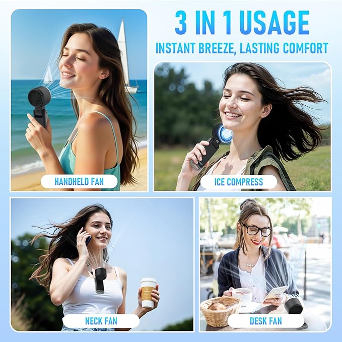 - 12H Max Cooling Time – Rechargeable portable handheld fan delivers up to 12 hours of continuous breeze. Fully recharges in 3 hours via fast Type-C charging. Adjustable wind speeds let you enjoy 3-12 hours long-lasting comfort anytime and anywhere.