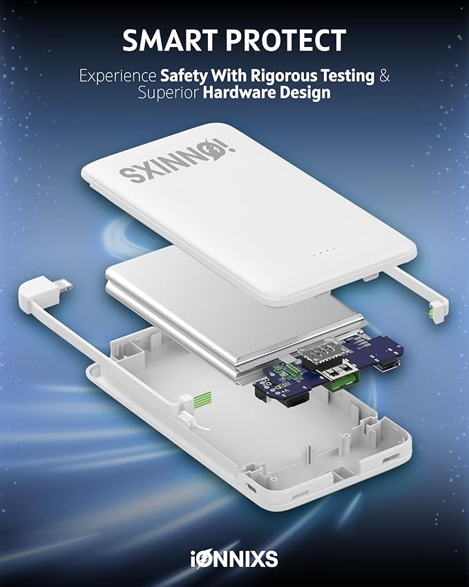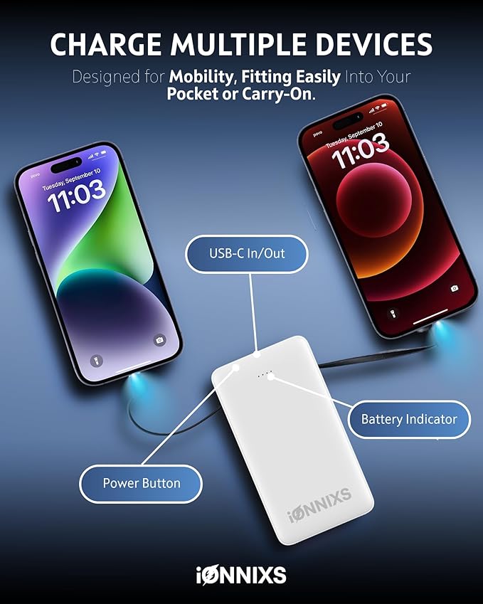 - Pocket-Sized, Travel-Ready Design: The ultra-slim body of the IONNIXS portable phone charger fits easily into your pocket, laptop bag, handbag, or carry-on. It's the ideal power option for professionals, students, and travelers who appreciate a sleek, minimalist design.