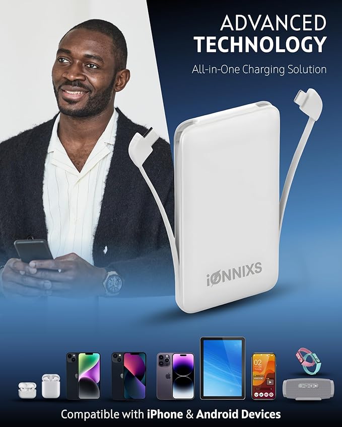 - Built-in USB-C and Lightning Cable: Designed for simplicity and speed, the IONNIXS C-1019 phone power bank has integrated USB-C and Lightning cables, eliminating the need to bring additional. Ideal compatibility with Android and Apple smartphones, iPhone 16/Pro/MAX, iPhone 15/Pro/MAX, iPhone 14/Pro/MAX and more, without causing clutter or bulking!