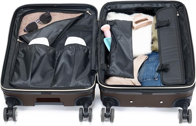 - Luggage main compartment interior features a hanging side zipper pocket, and a divider panel with a zippered mesh pocket and clips to hold belongings in place.