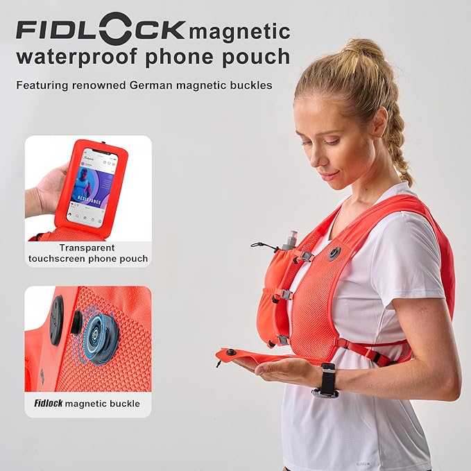 - 【Quick Phone Access】: A specially designed waterproof phone pocket with a transparent touchscreen. Equipped with imported FIDLOCK professional magnetic buckles, the pocket can be unlocked with one hand and quickly retracted to fit tightly against the running water vest. Everything is designed for convenience