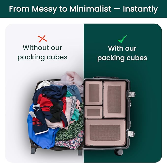 - Smart Features for Easy Packing: Each packing cube has side carry handles for quick grabbing and packing. Breathable mesh tops let you see what’s inside while keeping contents fresh and protected from spills or moisture.