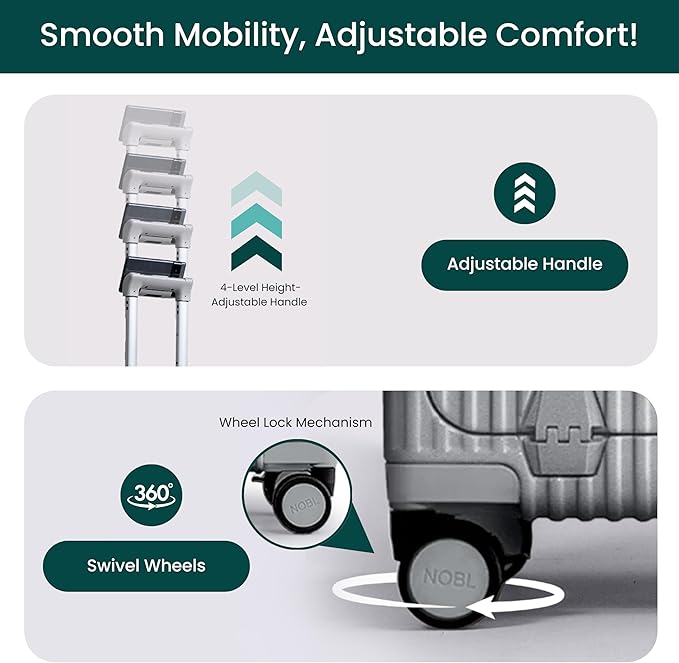 - Effortless Mobility & Comfort: 360° spinner wheels glide smoothly, and the 4-level height adjustable handle ensures easy handling. Bag holder studs let you secure extra bags, perfect for business trips and weekend getaways.