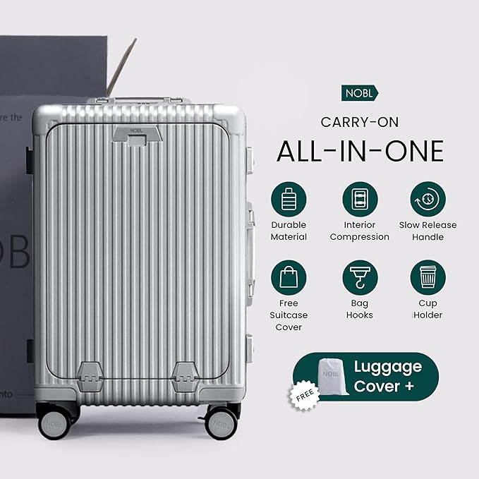 Nobl Travel Carry On Luggage, Noble Zipperless Aluminum Frame PC Hard Shell Suitcase, 20.8"x15"x8.7" Airline Approved, 360° Spinner Wheels, TSA Locks, USB Charging Port, Cup & Phone Holder - Silver