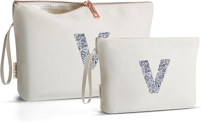 A-Z BAG 2pcs Personalised Makeup Bag Set, Canvas Cosmetic Bag with Rhinestone Initial, Birthday Gifts for Women (V, Beige)