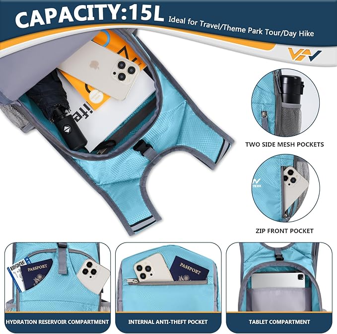 - ✅【SPACIOUS WITH MULTIPLE POCKETS】Our 15L Foldable Backpack features multiple compartments for easy packing and organization to accommodate clothes, books, snacks, travel essentials needed for day hikes.This small hiking backpack has one open pocket in the center available for flexible access to items and two mesh side pockets for water bottle or umbrella. The internal pocket provides a secure storage for your wallets, phones, cards or keys.