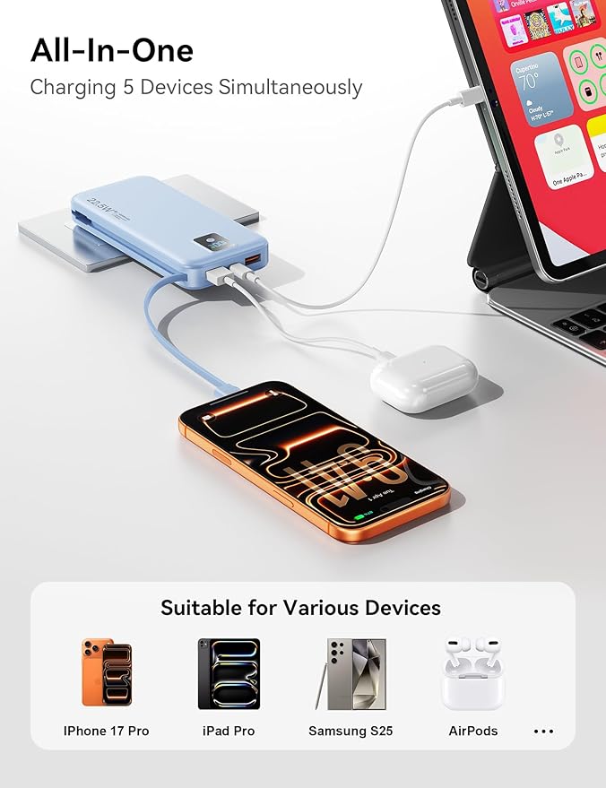 - γππππππ¦ππ‘ + ππ.ππ π πππ ππππππππγβΈ12000mAh high capacity portable charger delivers 2.4 charges for iPhone 17, 2.9 charges for iPhone 17 Air, 1.2 charges for iPad Air 5, or 2.3 charges for Samsung S24. 22.5W fast charging power bank fuels your phone battery from 0% to 60% in just 30 minutes, ideal for quick top-ups during morning routines, meetings, or airport waitsβno more long charging sessions
