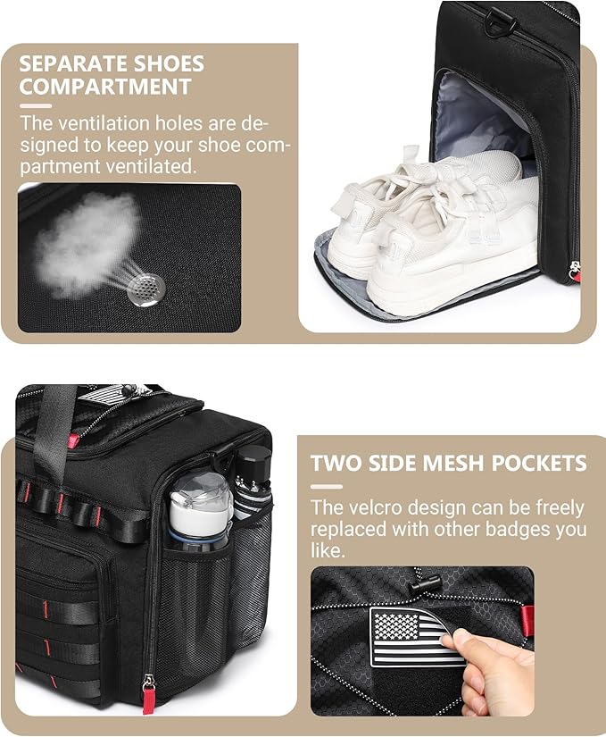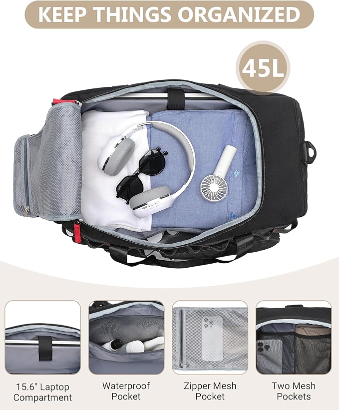 - 45L Large Capacity Duffle Bag: MCBD gym bags for men/women are spacious enough to hold 4-5 days of travel clothing and daily necessities, meeting your travel needs. This sports bag has multiple compartments, including a separate shoe compartment, a 15.6-inch laptop compartment, wet pocket, water bottle pockets, and other pockets. Also comes with an extra toiletry bag. Let your items be stored in a convenient and organized space for easy access. Size: 21.3” × 12.2” × 10.7 ”.Black