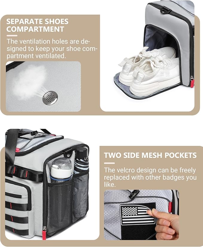 MCBD Gym Bags for Men & Women, 45L Travel Duffle Sports Backpack with Shoes & Laptop Compartment, Large Workout Carry On Bag Weekender Overnight Tote, Grey