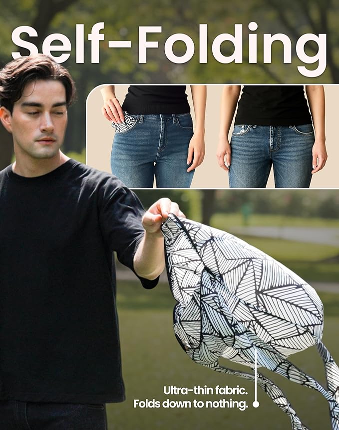 - SELF-FOLDING: Our secret ingredient is our unique featherlight ultralight diamond ripstop nylon, which allows the bag to fold on itself incredibly densely, with virtually no air pockets. No folding needed. Just stuff it in your pocket, and the bag practically disappears. Carrying a bag has never been more convenient.