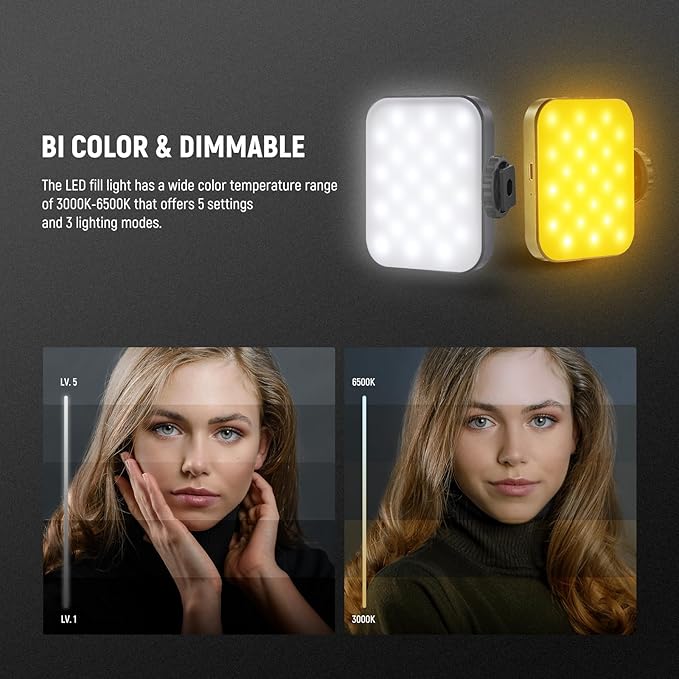 - 【Magnetic Bi Color LED Fill Light】 The BL48B bi color LED video and photo light offers 3000K-6500K color temperature, 5 dimming levels, 257lux at 0.5m, and 95+ CRI. The integrated 1000mAh battery fully charges in 130 minutes and works continuously for 75 minutes at 100% brightness. Small and lightweight, it can magnetically attach to phones compatible with MagSafe iPhone for on the go photography and videography lighting, makeup streaming, recording