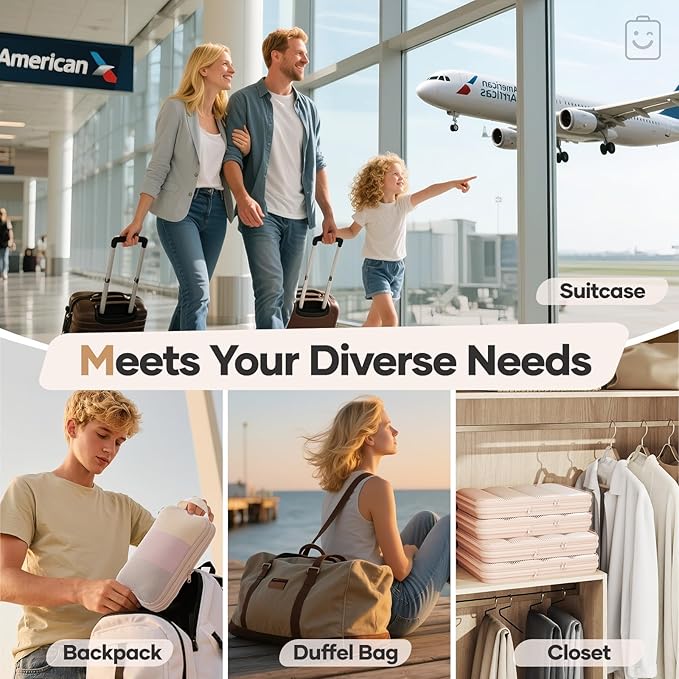 - All-in-One Organization for Your Travel Needs - This 11-piece set includes six compression cubes (S/M*2/L*2/XL) for systematic packing: S for underwear/socks, M for T-shirts and shirts, L for jeans and light sweaters, and XL for coats or bulky items. Also features two PVC toiletry/makeup bags, a machine-washable laundry bag, a shoe bag, and a multi-purpose zippered pouch—keeping your luggage tidy and efficient.