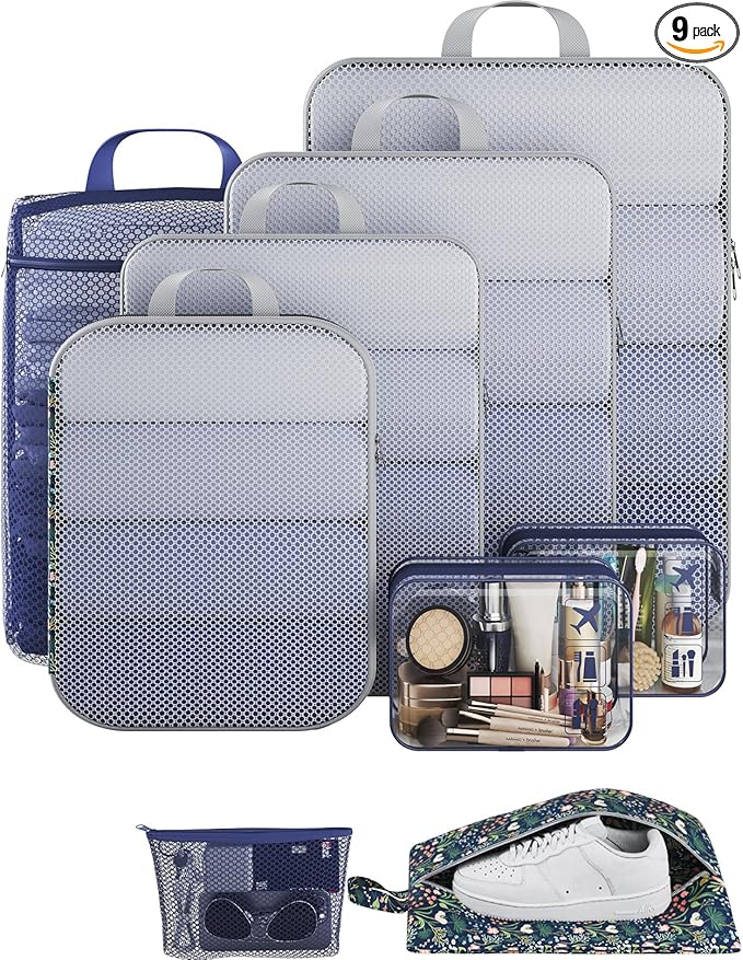 Veken 9/11 Set Compression Packing Cubes for Travel Essentials,Compressible Expandable Large Luggage Suitcase Organizer Bags for Clothing,Durable Space Saver Storage Bags(Dark Blue Floral)
