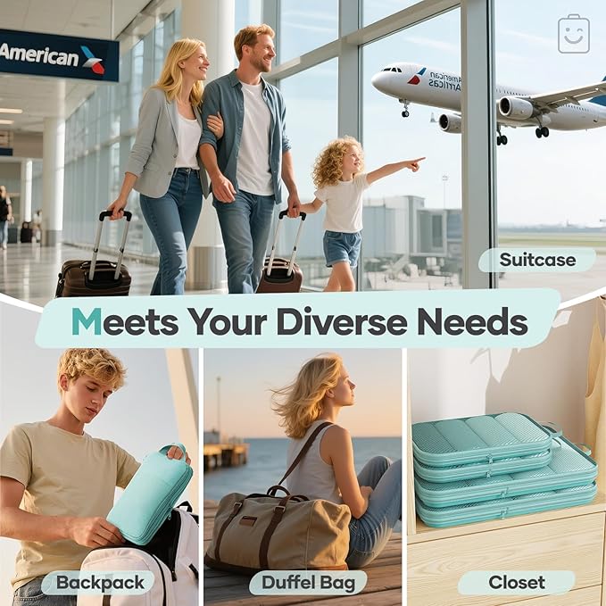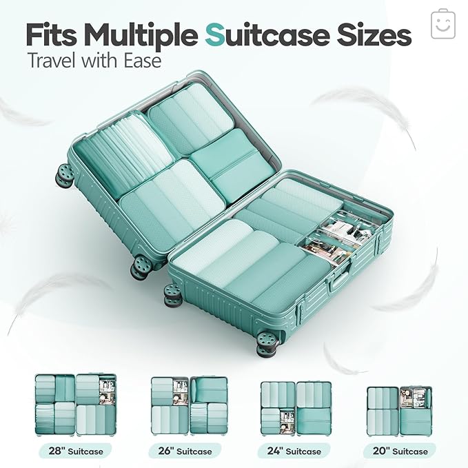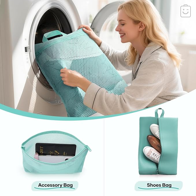 - All-in-One Organization for Your Travel Needs - This 9-piece set includes four compression cubes (S/M/L/XL) for systematic packing: S for underwear/socks, M for T-shirts and shirts, L for jeans and light sweaters, and XL for coats or bulky items. Also features two PVC toiletry/makeup bags, a machine-washable laundry bag, a shoe bag, and a multi-purpose zippered pouch—keeping your luggage tidy and efficient.