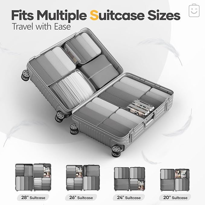 - All-in-One Organization for Your Travel Needs - This 11-piece set includes six compression cubes (S/M*2/L*2/XL) for systematic packing: S for underwear/socks, M for T-shirts and shirts, L for jeans and light sweaters, and XL for coats or bulky items. Also features two PVC toiletry/makeup bags, a machine-washable laundry bag, a shoe bag, and a multi-purpose zippered pouch—keeping your luggage tidy and efficient.