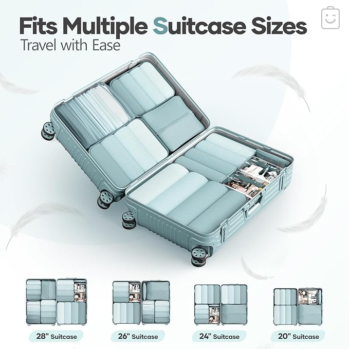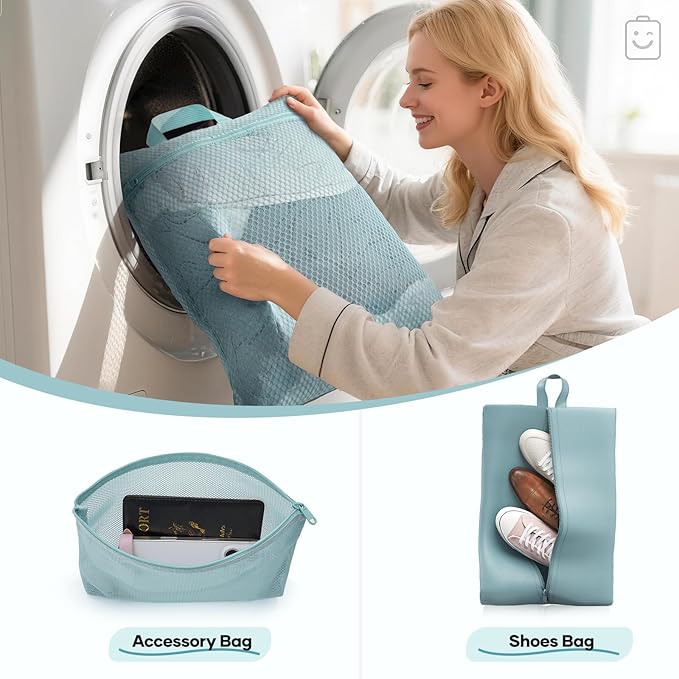 - All-in-One Organization for Your Travel Needs - This 9-piece set includes four compression cubes (S/M/L/XL) for systematic packing: S for underwear/socks, M for T-shirts and shirts, L for jeans and light sweaters, and XL for coats or bulky items. Also features two PVC toiletry/makeup bags, a machine-washable laundry bag, a shoe bag, and a multi-purpose zippered pouch—keeping your luggage tidy and efficient.