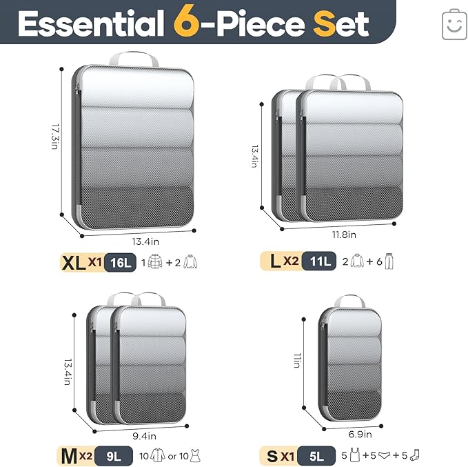 - Your Portable Travel Wardrobe - This 6-piece set includes 6 compression cubes in four sizes (S, M×2, L×2, XL) to keep your luggage tidy and organized. The S cube organizes small items like underwear and socks; the M cube fits T-shirts and shirts; the L cube holds jeans and light sweaters; while the XL cube accommodates bulkier clothing such as coats and sweaters.