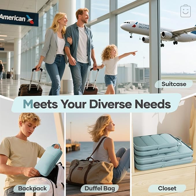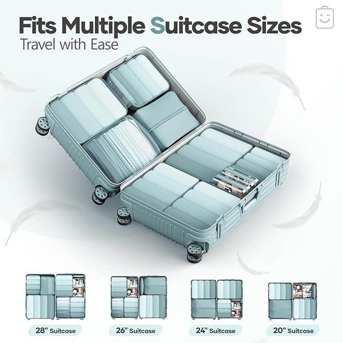 - All-in-One Organization for Your Travel Needs - This 11-piece set includes six compression cubes (S/M*2/L*2/XL) for systematic packing: S for underwear/socks, M for T-shirts and shirts, L for jeans and light sweaters, and XL for coats or bulky items. Also features two PVC toiletry/makeup bags, a machine-washable laundry bag, a shoe bag, and a multi-purpose zippered pouch—keeping your luggage tidy and efficient.