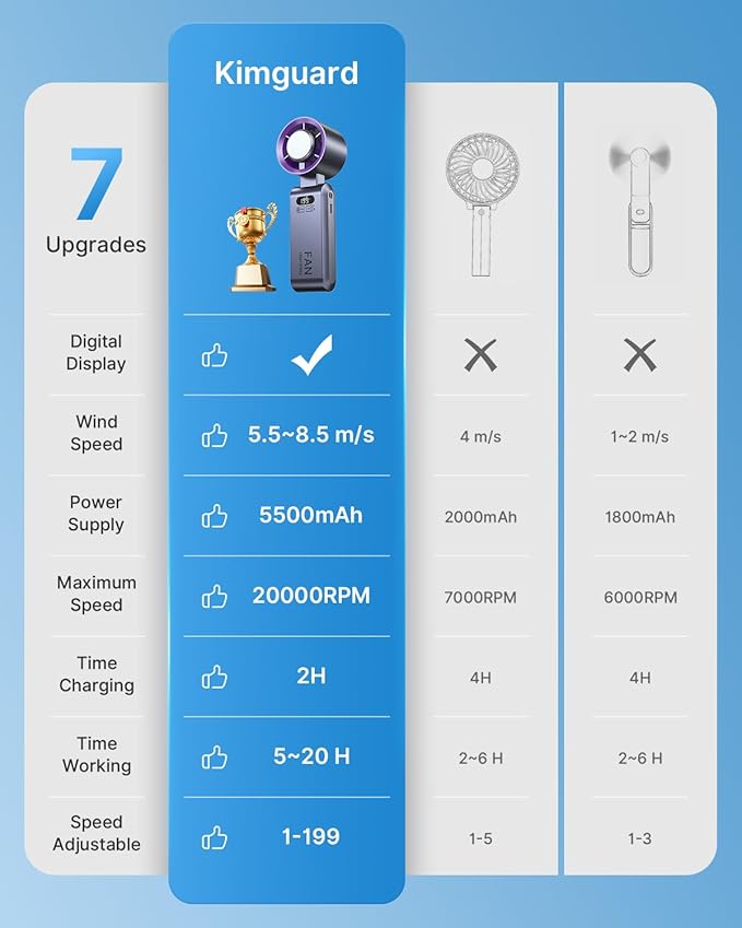 - Ultra-Fast Turbo Cooling: Features an advanced 7-blade design paired with a high-speed three-phase brushless motor, delivering a maximum wind speed of 8.5m/s – 2x faster than traditional hand held fans! With a 20000 rpm maximum speed, it instantly blows away the heat, keeping you cool and comfortable all day long