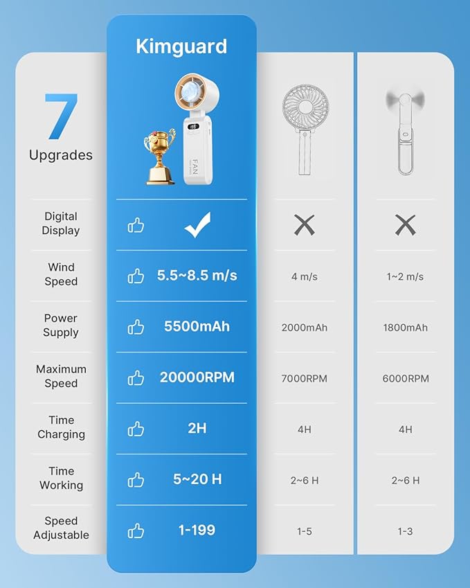 - Ultra-Fast Turbo Cooling: Features an advanced 7-blade design paired with a high-speed three-phase brushless motor, delivering a maximum wind speed of 8.5m/s – 2x faster than traditional hand held fans! With a 20000 rpm maximum speed, it instantly blows away the heat, keeping you cool and comfortable all day long