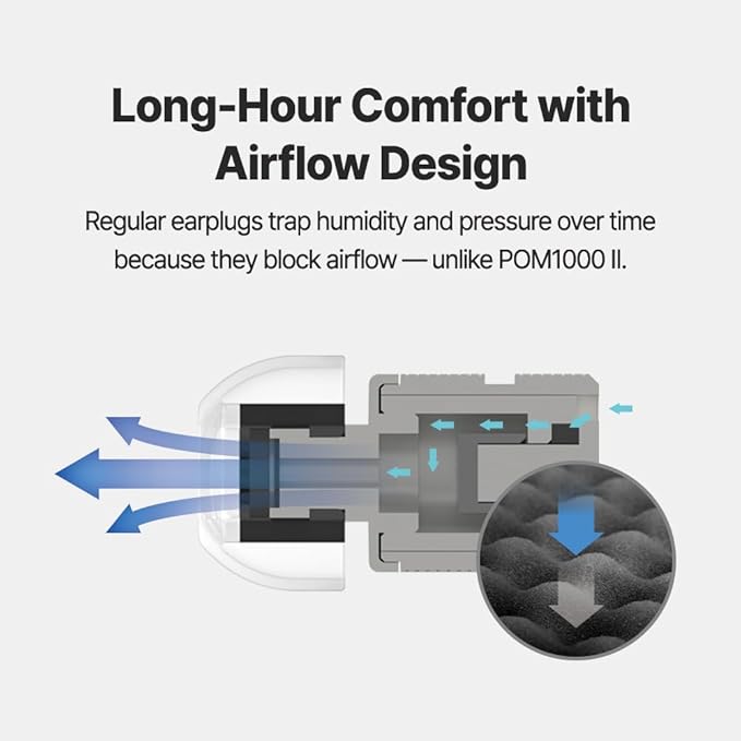 - Battery-Free & Reliable for Long Hours – Unlike electronic noise cancelling devices, POM1000 II ear plugs require no charging. Enjoy uninterrupted noise reduction during long flights, flight transfers, or motorcycle rides — no sudden shutdowns, just stable protection anytime, anywhere.
