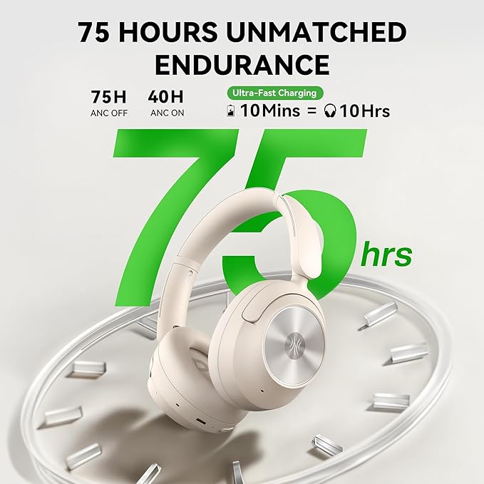 - 75 Hours Unmatched Endurance: Enjoy up to 75 hours of playback in Bluetooth mode or 40 hours with ANC on. Need a quick boost? Just 10 minutes of charging gives you 10 hours of playtime — perfect for travel, daily commutes, or long office sessions.