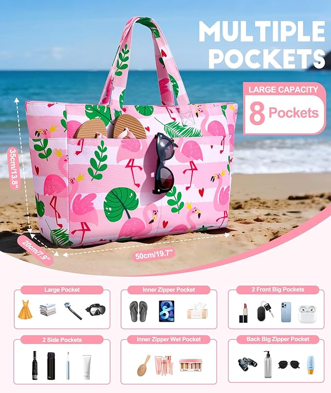 - Large Storage Space: This beach bags allows you to conveniently pack all your outdoor essentials, such as 2 or 3 beach towels, clothing, a wallet, swimming gear, beach toys, water shoes, sunglasses, water bottles, and still leaves room for more. The beach bag with zip has a capacity of 45L and features 8 pockets: 1 large pocket, 5 external pockets, 1 internal zipper pocket and 1 internal zipper wet pocket. Equipped with a zipper closure to ensure your belongings won't accidentally fall out.