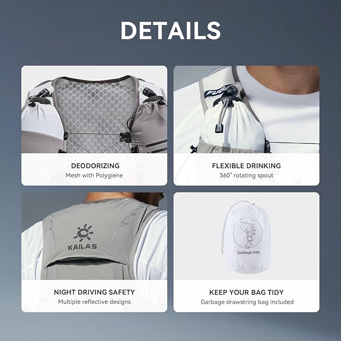 • LIGHTWEIGHT DESIGN: The backpack weight is only 230g(Medium Size), which is mainly suitable for trail running, as well as running, marathon, and light hiking. Equipped with Two 500ml TPU soft kettles, a single weight of 38g, the outward spout can rotate 360°, convenient for drinking water, when the water volume of the bottle is low, the kettle silo can be contracted, and the kettle can be stabilized without shaking, reducing interference to trail runners