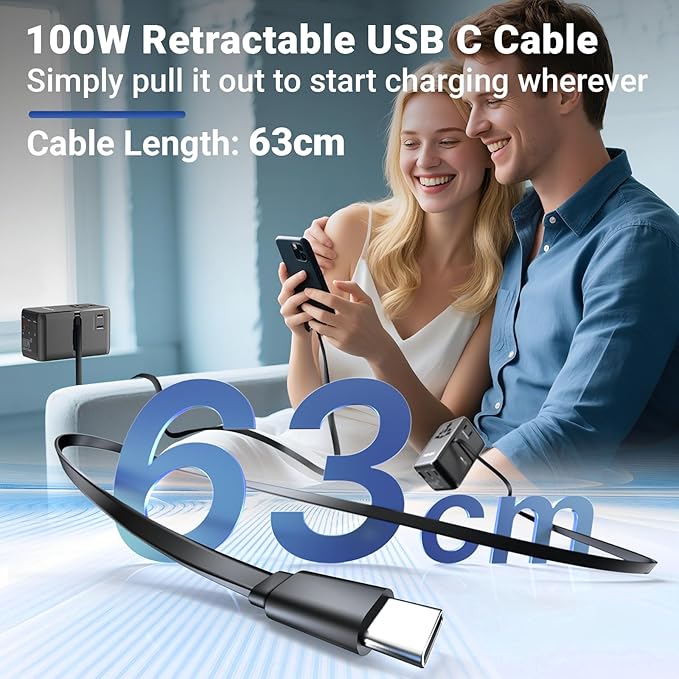 - 【100W USB-C Retractable Cable】The MINIX international plug adapter boasts a maximum power output of 100W via its integrated, retractable USB-C cable.Cable Length:63cm.Simply pull it out to start charging wherever and whenever you need, eliminating the hassle of carrying additional cables