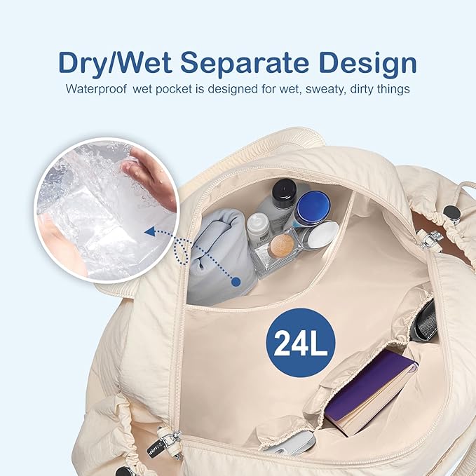 - ORGANIZED PREMIUM STORAGE: Measuring 17 x 7.5 x 12 inches, keep your daily outings thoroughly organized with style all over. A fully lined interior along with 3 slip pockets, a zippered waterproof PVC pocket specially designed for wet/dirty items. The exterior features 2 zippered pockets, 2 side drawstring pockets for storing water bottles. In addition, this quilted puffy gym bag also comes with a toiletry bag for your cosmetics.
