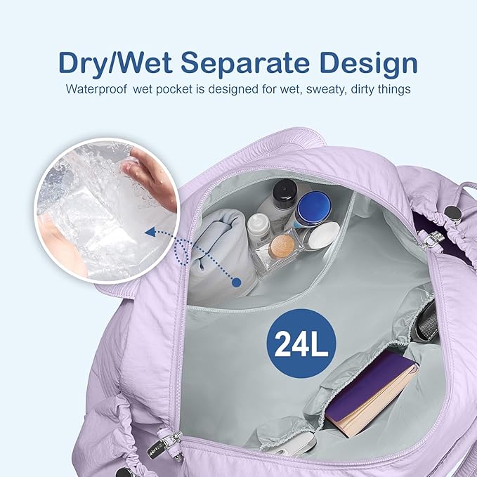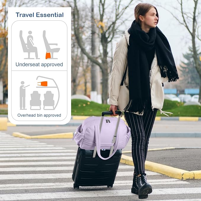 TOPDesign Travel Duffel Bag for Women, Puffer Gym Bag Sports Tote with Wet Pocket, Carry On Weekender with Luggage Sleeve (Light Purple)