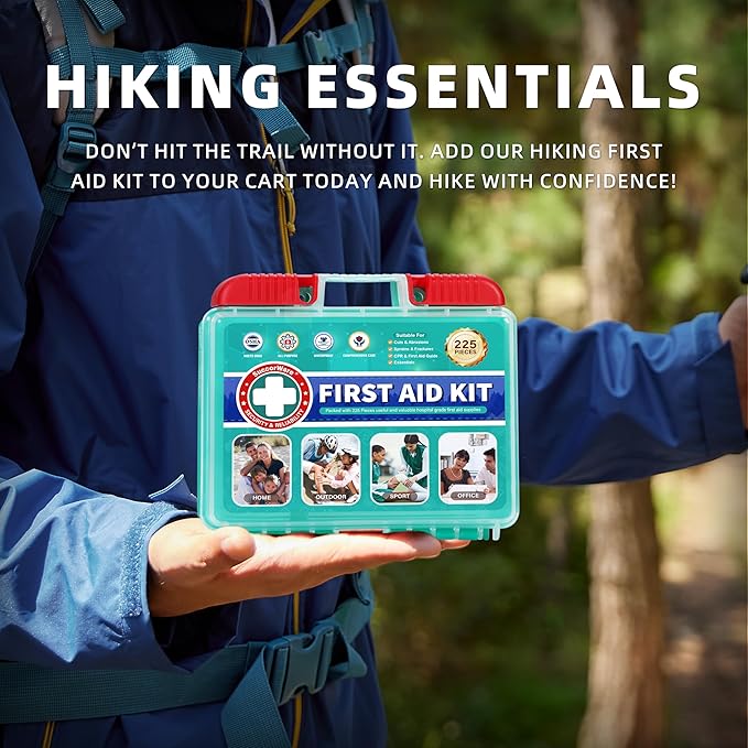 - Comprehensive Emergency Solution: Our portable first aid kit includes 225 pieces essential items such as various sizes of bandages, sting relief pad, and gauze pads, ensuring you are well-prepared for daily needs and emergencies