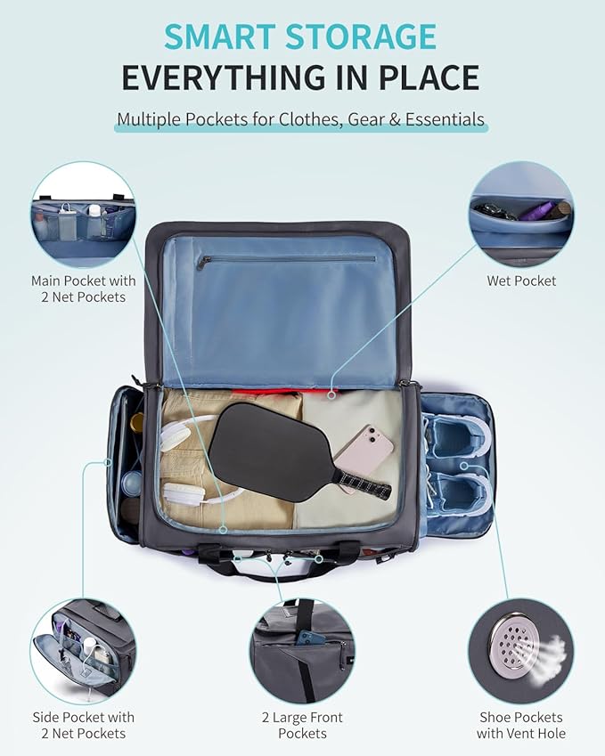- 【Spacious & Organized】 40L large capacity with multiple compartments. Dedicated ventilated shoe compartment keeps your sneakers or dirty gear apart from clean clothes, making post-gym packing more hygienic. Built-in waterproof wet pocket holds damp towels or swimwear, while multiple interior and exterior pockets keep essentials organized.