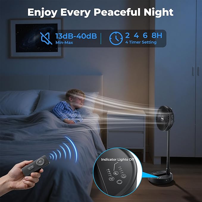 - Foldable & Height Adjustable Design: Innovatively collapses into a compact 4.6 inch base for easy storage and portability; the fan height is fully adjustable from 14.09” to 35.85”, allowing flexible use as a desk fan, floor fan, or standing fan