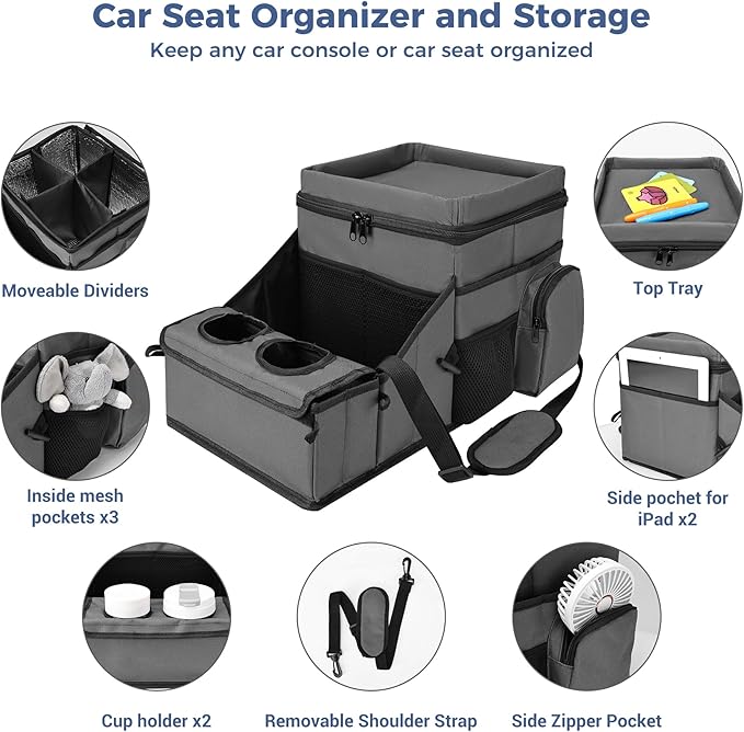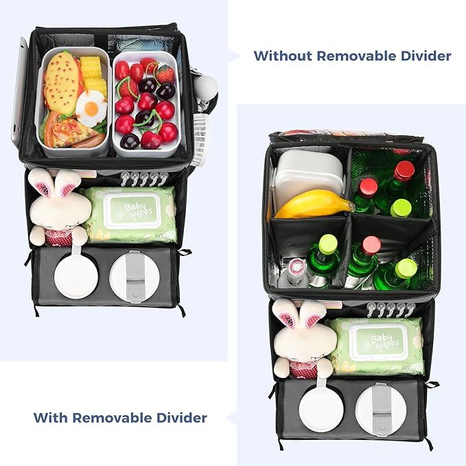 - Car Seat Organizer with Cooler: The interior of the middle seat car organizer is insulated with removable compartments that can be used as coolers, storage bins or file rooms. Note: When used as a cooler, use a cold bag to keep the contents dry