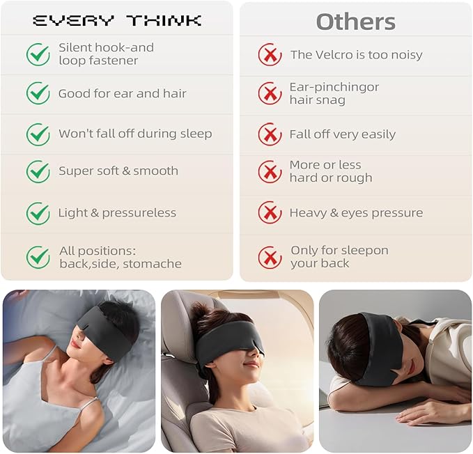- 【Custom Fit】Upgraded silent hook-and-loop fasteners adapt to all head sizes. Sleeping mask suitable for both men and women. Perfectly contours to eyes, ears, and head, stays secure even when sleeping on your side.