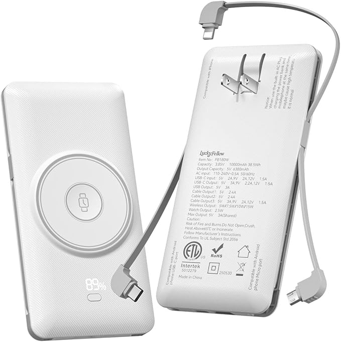 - Build in Cable and Wall Plug:Recharge the portable charger in two ways, built-in AC wall plug for a full charge in 3-4 hours, or use the Type-C (PD20W) port in 2.5-3 hours. At the same time, it comes with 3 different charging cables. You can charge different models of iOS or Android devices simultaneously. No matter where you go, you no longer need different generations of plugs and charging cables!