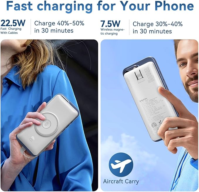 - High-Speed Wireless & Wired Charging: Max 15W Wireless and 22.5W USB-C & Self-Cable Fast Charging. Tested to deliver 2.5 full charges for iPhone 16 Pro and 1.5 charges for 16 Pro Max, 12-15 charges for Apple Watch S10 by Wireless charging. If you charge with the cable that comes with the power bank, you can charge 16pro 3 times and the 16pro max 2.2 times. Max 15W wireless charging refuels 50% in 30 mins, 7.5W wireless charging refuels 30% in 30 mins, 22.5W PD wired charging hits 70% in 35 mins. No inflated specs—honest power for all-day adventures.