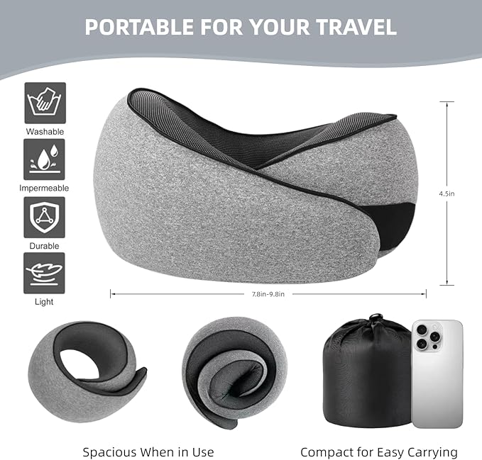 - Premium memory foam neck pillow:The travel neck pillow is made of premium slow rebound memory foam, which is both comfortable and long-lasting. It provides adequate support while helping to relieve neck pressure caused by long-distance travel or office work