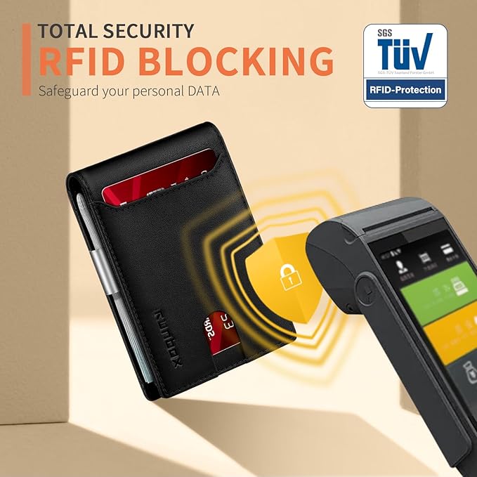 - ππ ππ ππ§ππ’-ππ‘πππ ππππππππ - this slim wallet for men equipped with German Instiute Certified RFID Security technology, a unique metal composite, engineered specifically to block 13.56 MHz or higher RFID signals to protect the valuable information and privacy