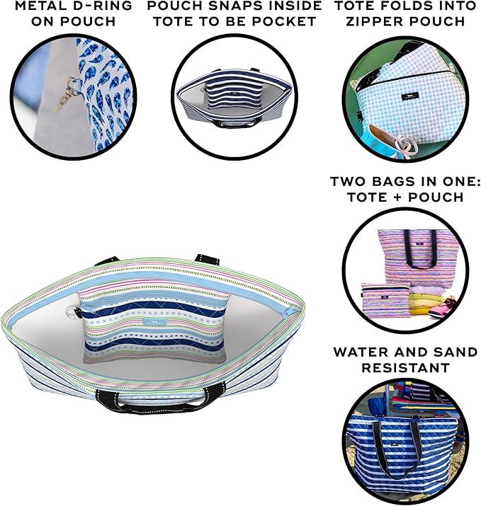 - TOTE AND POUCH ARE WATER RESISTANT, and wipe clean, making them ideal for dodging dirt.
