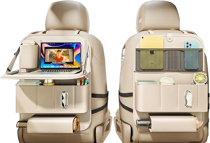 Car Seat Organizers,Multi-functional Back Seat Protectors, Storage Pouches, Child kicking prevention and Tray Holders (for Cars, Kids, Seat Back and Rear Seats) (Beige, 2 Pcs)