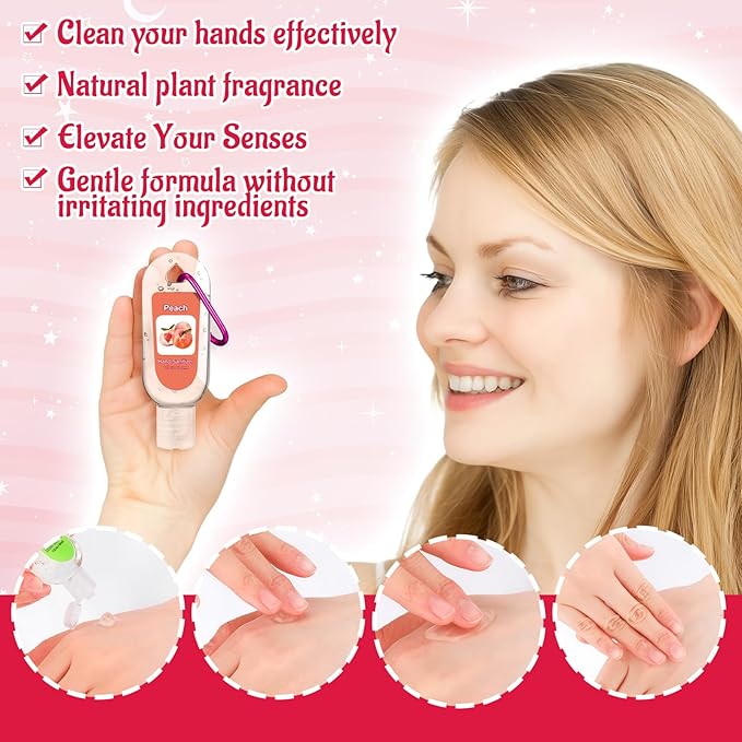 - Diverse Aromatic Selection: experience a Variety of Delightful Scents with our mini hand sanitizer Set, 6 Fragrances: lemon, lavender, mint, rose, vanilla, and peach; Each scent is crafted to offer a long lasting olfactory pleasure while keeping your hands fresh; From invigorating mint to calming lavender, there's a scent for every preference