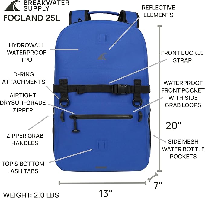 - CONQUER IT ALL WITH THE FOGLAND 25L BACKPACK – WHILE KEEPING YOUR GEAR SAFE & DRY: The Fogland 25L Backpack is 100% waterproof, fully submersible – and it floats – and it's made of our virtually indestructible Hydrowall TPU for complete protection in all climates, conditions, and environments. This new Marker Blue colorway is made of our lightest Hydrowall material yet (600D Polyester TPU) to make it perfect for everyday use.