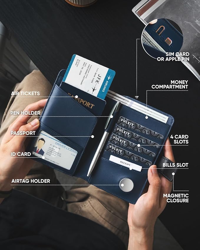 - Travel Passport Organizer- Includes a passport compartment, 2 SIM card slots, 5 credit card slots, a bills slot, an Airtag holder, an ID window, an air tickets compartment, a cash compartment, and a pen holder. Multi-purpose will be convenient for travellers or business men.