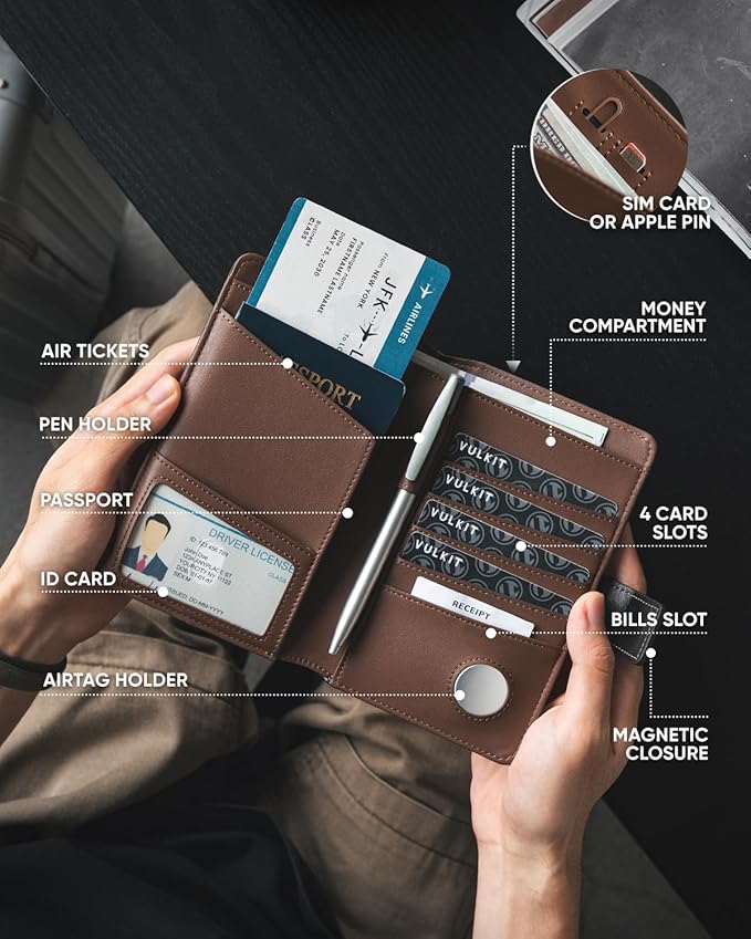 - Travel Passport Organizer- Includes a passport compartment, 2 SIM card slots, 7 credit card slots, a bills slot, an Airtag holder, an ID window, an air tickets compartment, a cash compartment, and a pen holder. Multi-purpose will be convenient for travellers or business men.