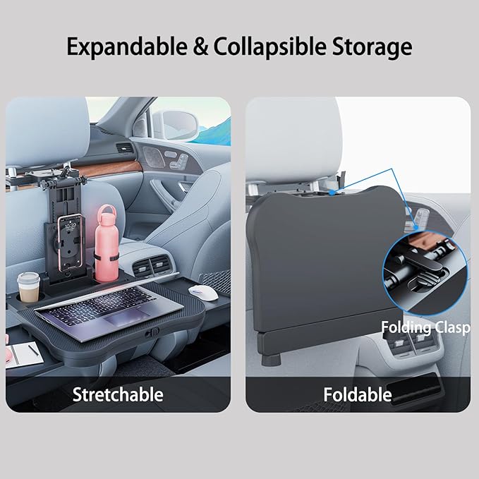 - 【Multifunctional Car Tray Table】Features 360° phone holder, dual cup holders, tablet groove, and expandable drawers. Non-slip mat keeps items secure during use. Perfect as a steering wheel desk or backseat organizer.