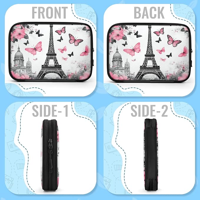 Paris Eiffel Tower Travel Cable Organizer Pouch Pink Butterfly Rose Electronics Accessories Carry Case Portable Water Resistant Storage Bag for Cord Charger Phone Earphone SD Card