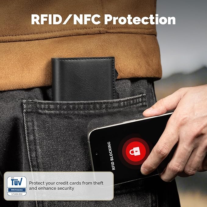 - Advanced RFID & NFC Blocking Wallet - The RFID blocking function of our men's wallets has been certified by the independent institute TÜV Germany for completely blocking the RFID frequency 13.56 MHz. Protect your sensitive information with confidence. The credit card holder features advanced RFID blocking technology, preventing unwanted scanning and electronic theft. Keep your credit and bank cards secure and enjoy peace of mind in today’s digital age.